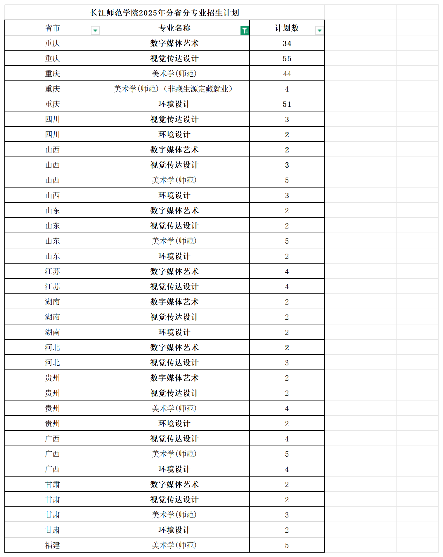 長江師范學院2025美術類招生計劃統計