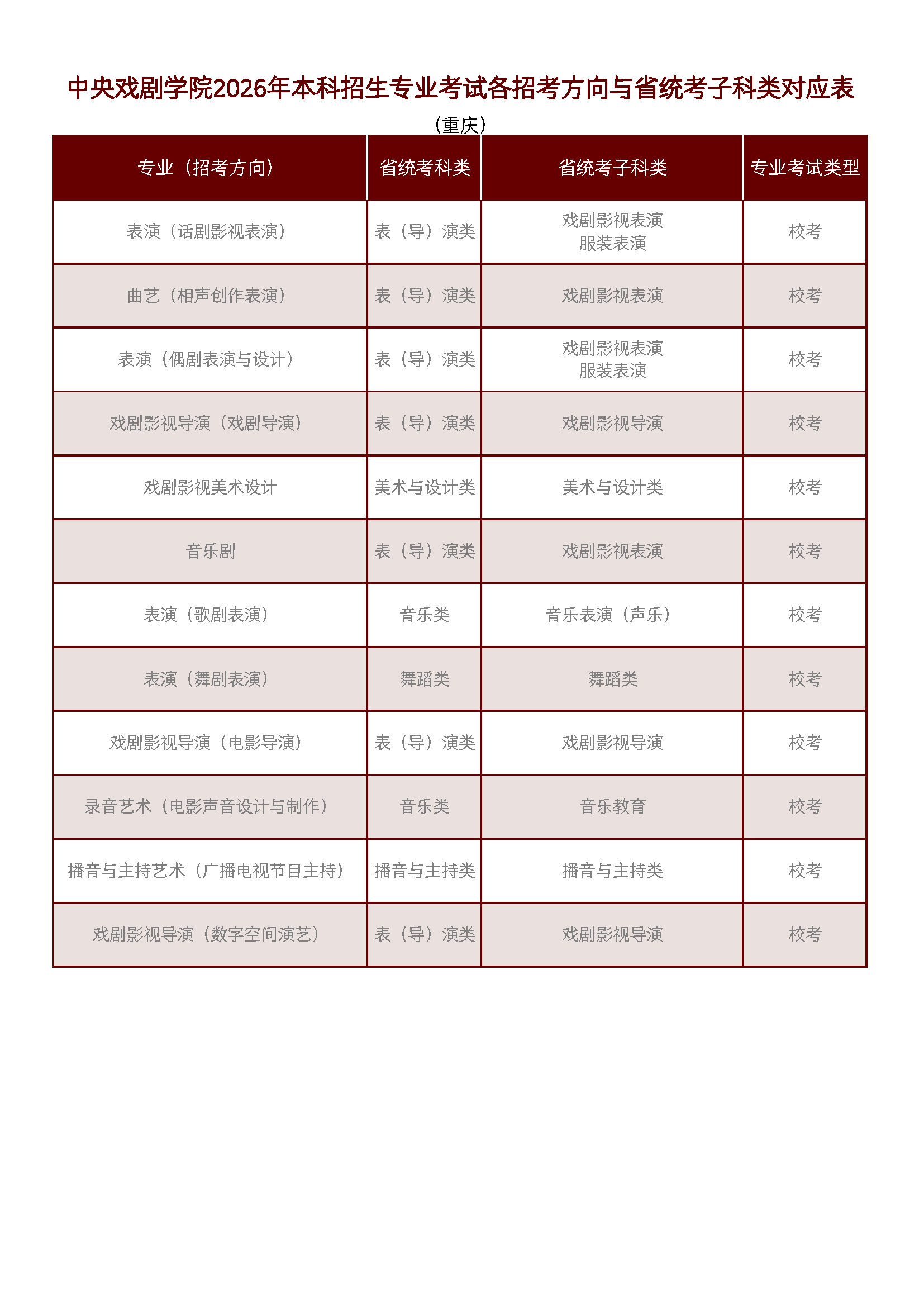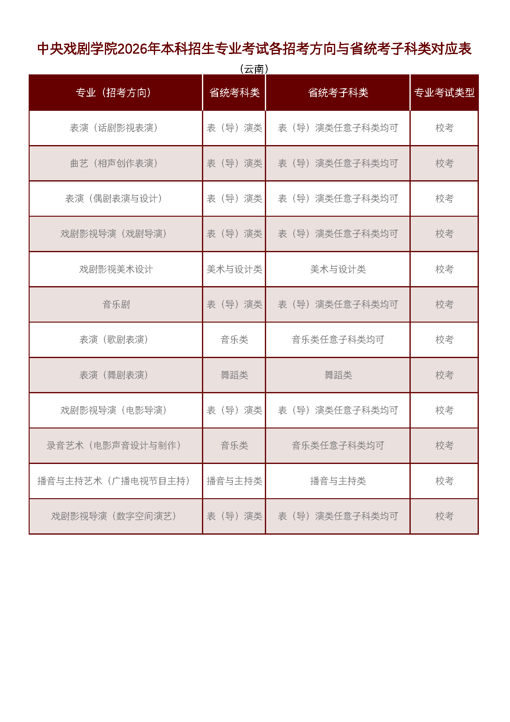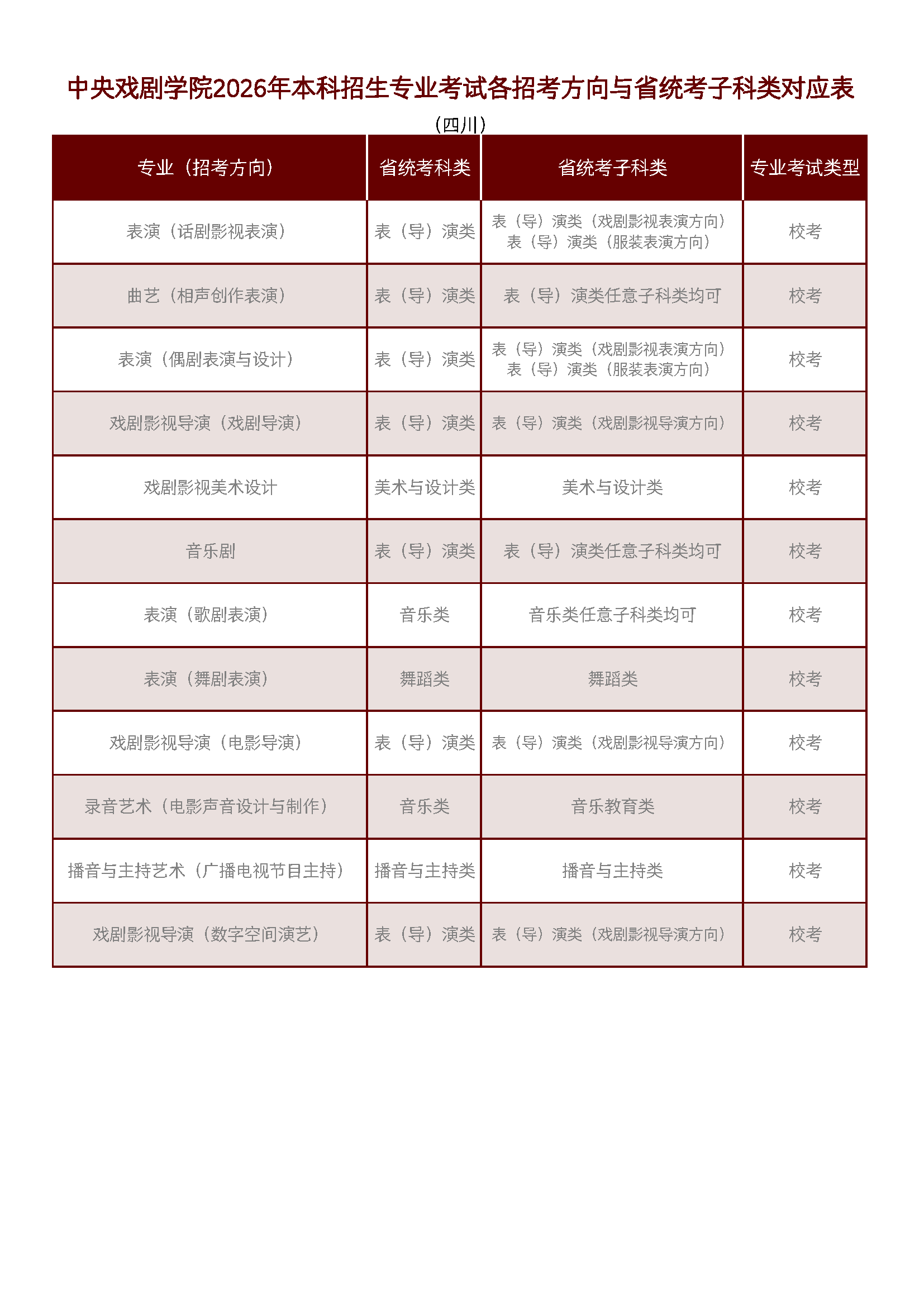 中央戲劇學(xué)院2026年本科招生專業(yè)考試各招考方向與省統(tǒng)考子科類對(duì)應(yīng)表