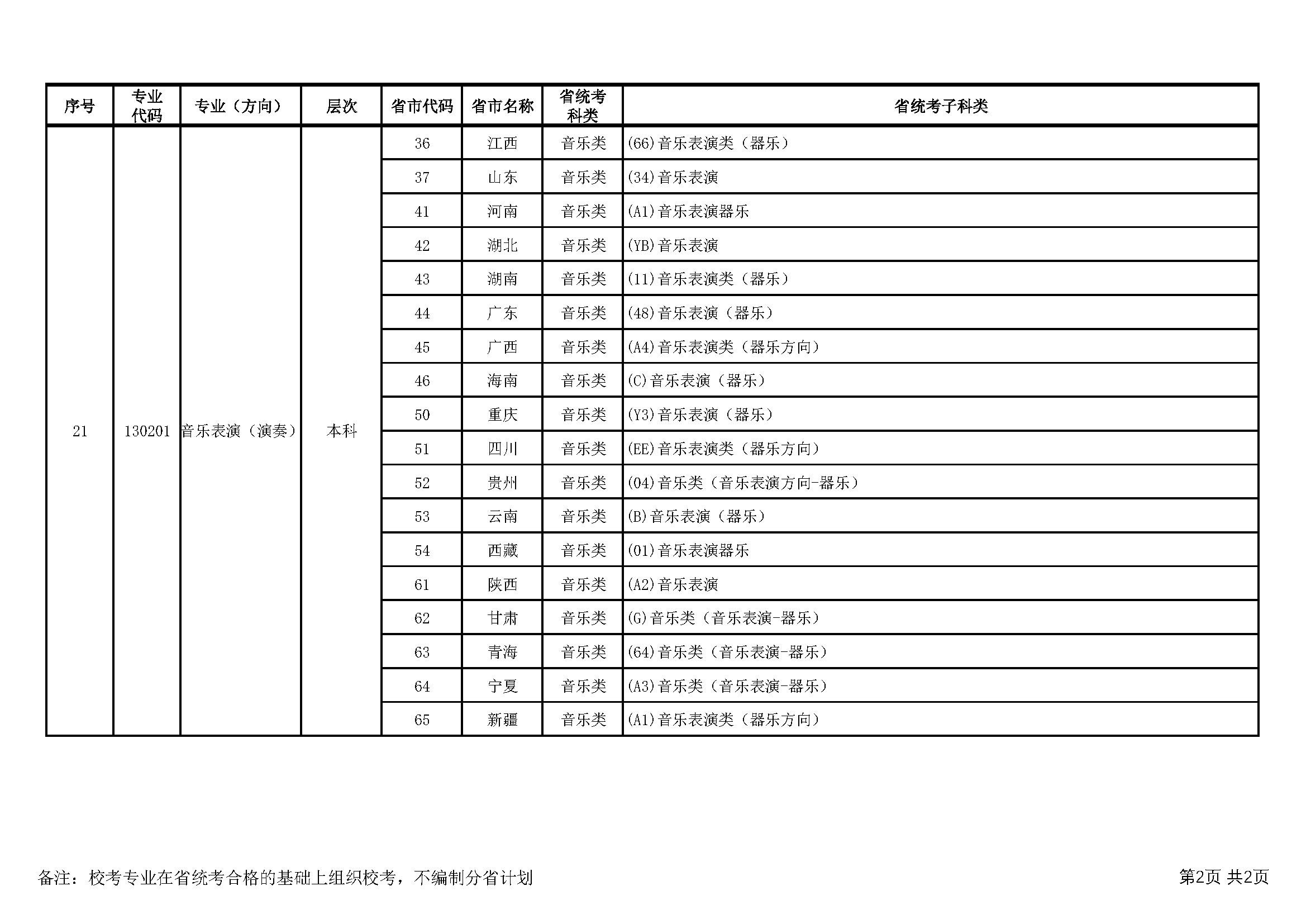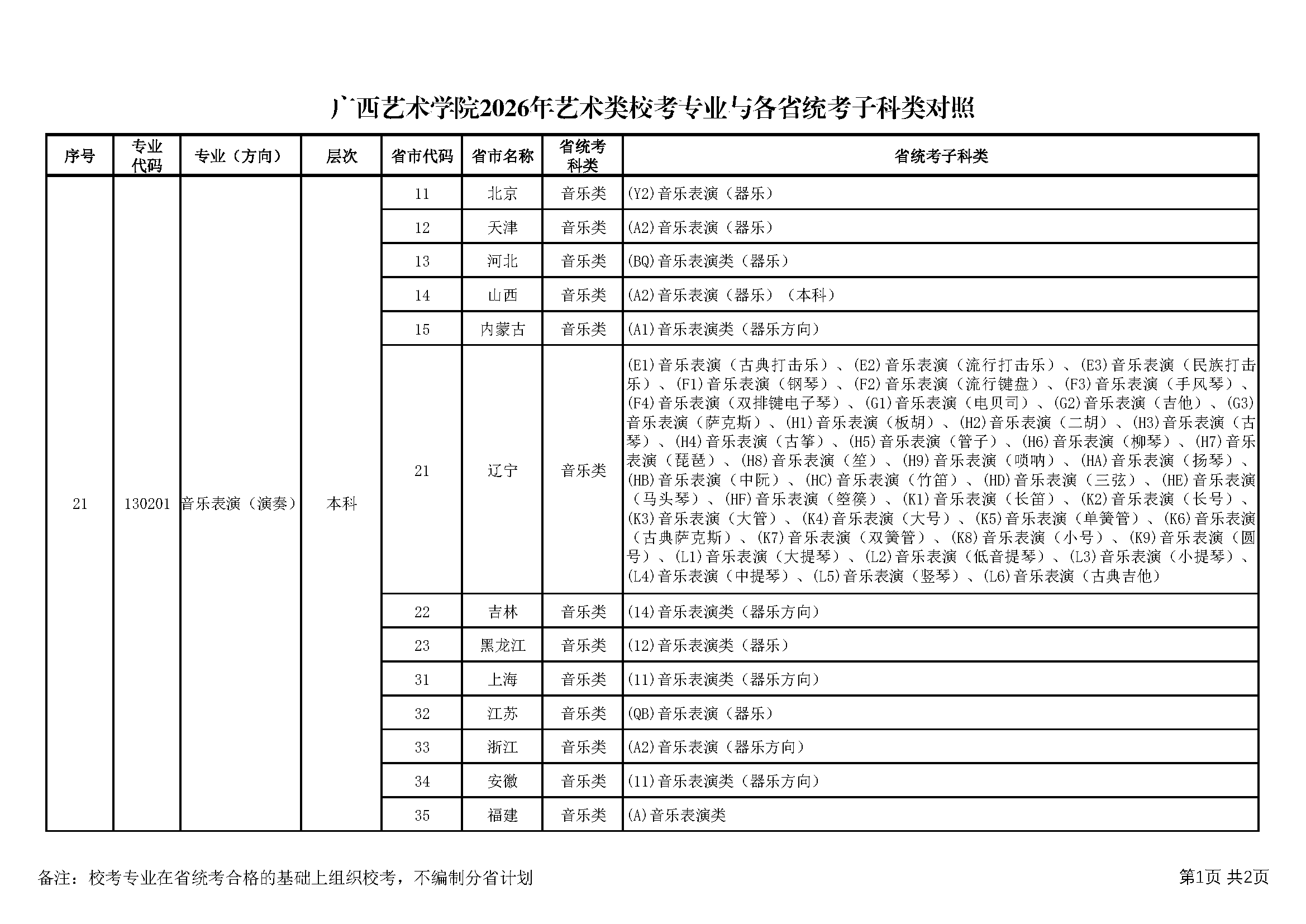 廣西藝術學院2026年藝術類校考專業與各省統考子科類對照表
